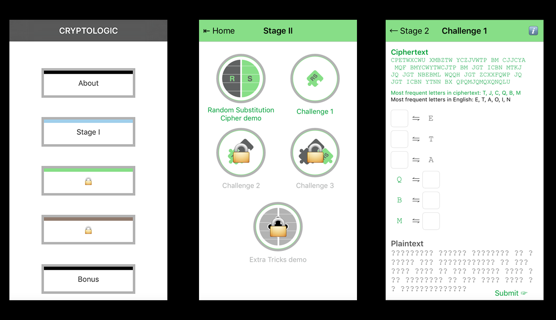 Figure 1. Structure of CryptoLogic on iPhone. Left: Main menu. Centre: Stage II. Right: A challenge page.